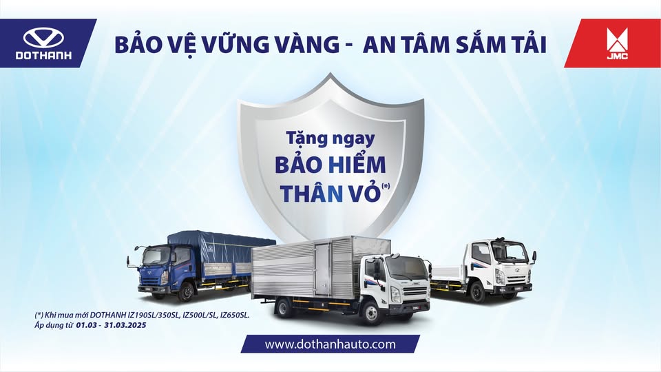Chương trình mua xe tải DOTHANH IZ mới, tặng BH thân vỏ sắp kết thúc. Khuyến mãi áp dụng cho các phiên bản xe thùng dài "L/SL", kéo dài đến hết 31.03.2025. Quý khách hàng hãy nhanh nhanh sở hữu xe và nhận ưu đãi!